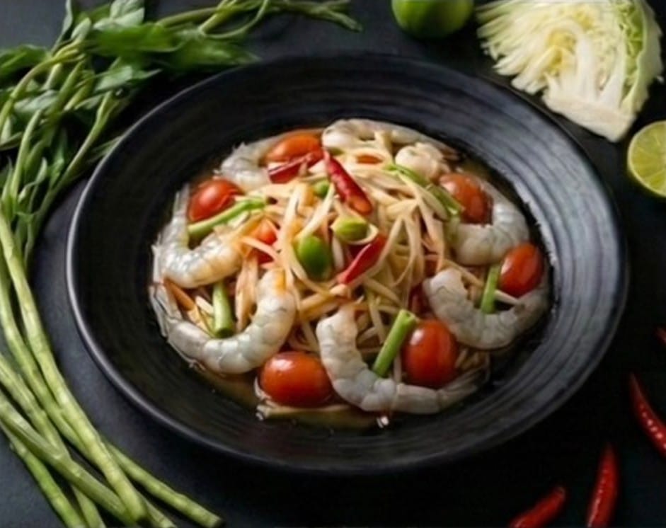 タム・マラクー・クン・ソット Papaya Salad with Fresh Shrimp